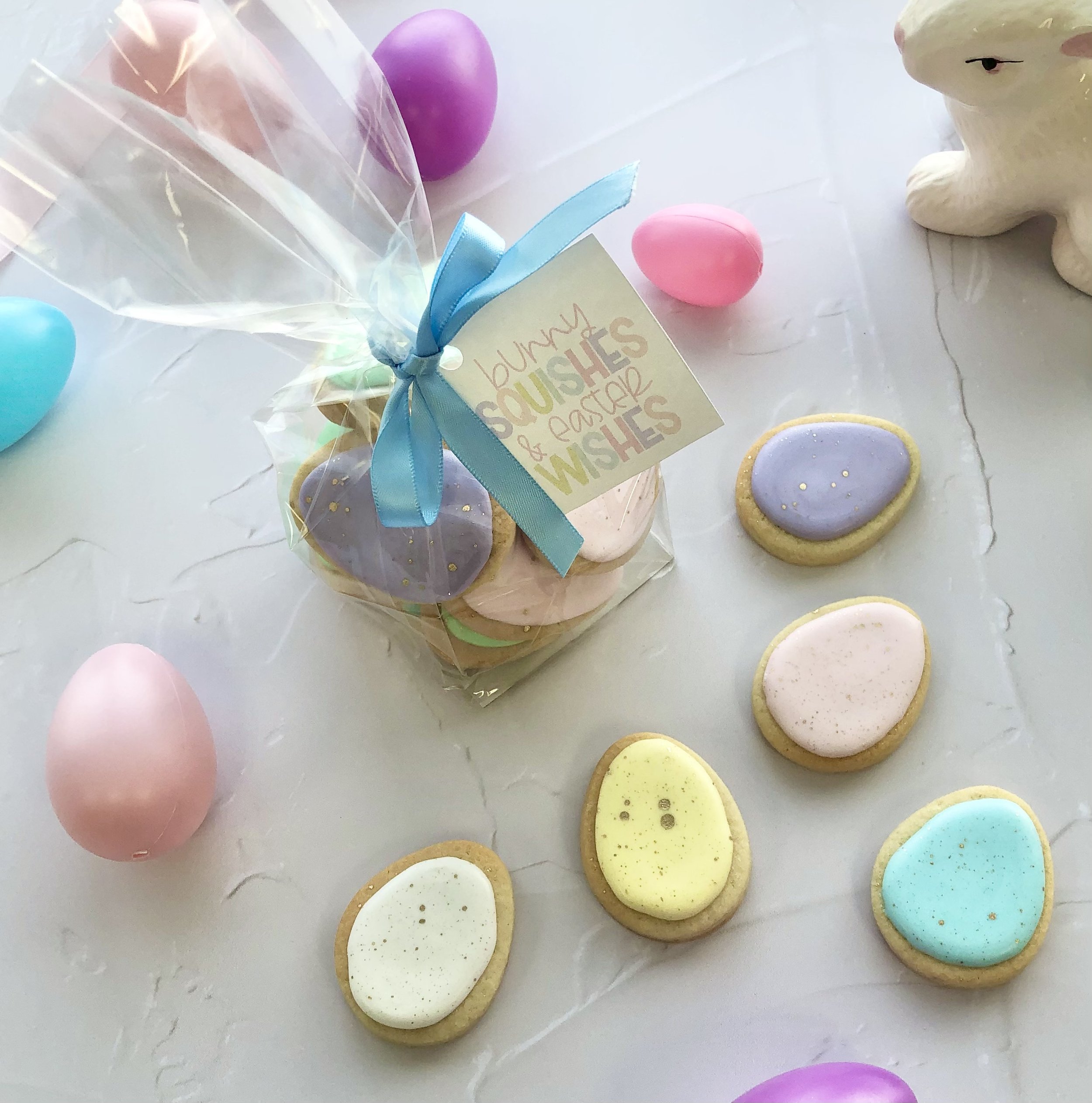 Bag of 12 sugar cookie mini eggs, decorated in pastel colours and gold flecks. Packaged in a clear bag with matching ribbon and Easter tag.
