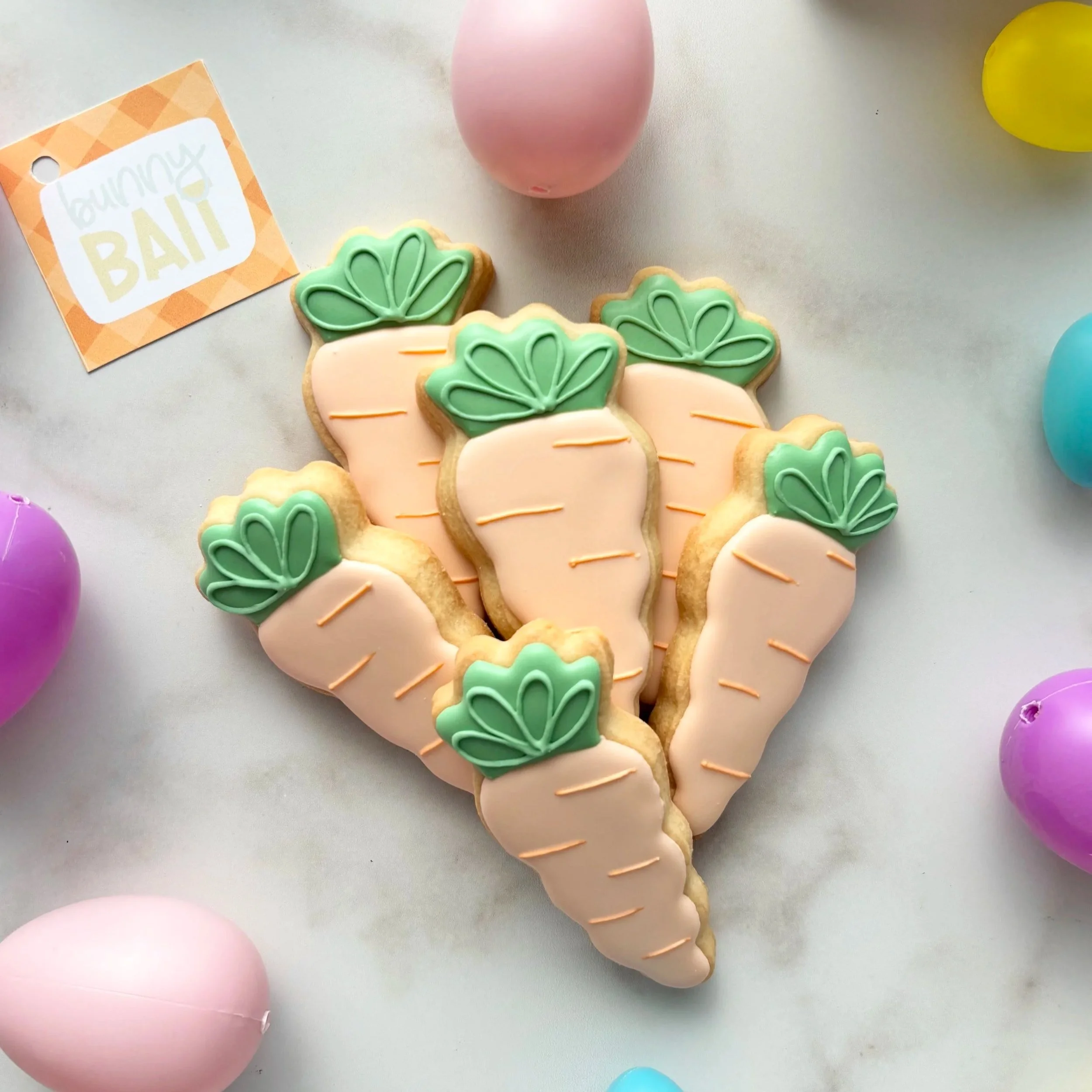 6 carrot sugar cookies packaged in a clear bag and tied with a matching ribbon and tag